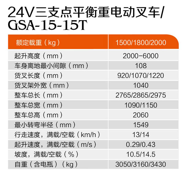 24V三支點(diǎn)平衡重電動叉車GSA-15-15T